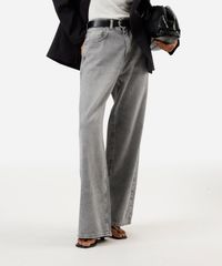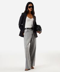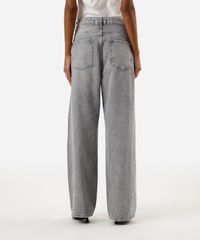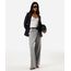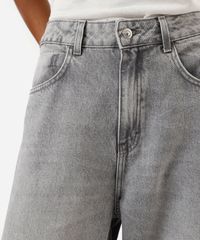 Calça feminina confeccionada em jeans. A peça tem a modelagem oversized, com construção reta e o caimento é confortavelmente solto ao corpo. O modelo tem cintura média, cós com passantes para cinto e fechamento frontal por botão e zíper. Possui três bolsos na parte frontal e dois aplicados na parte posterior. Detalhe de acabamento pespontado nas barras.