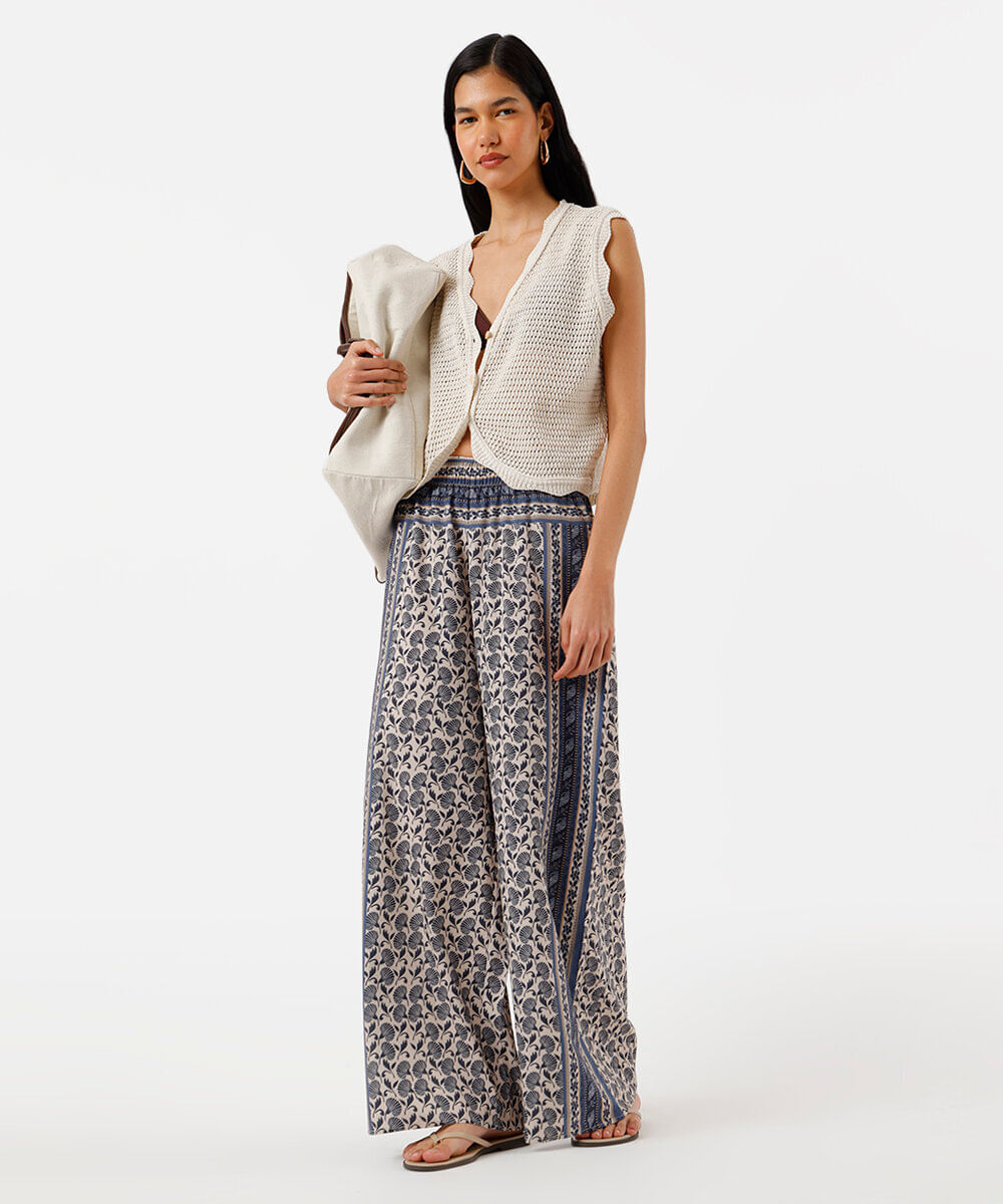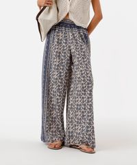Calça feminina confeccionada em tecido plano com estampa floral. A peça tem a modelagem pantalona, com construção reta e o caimento é confortavelmente solto ao corpo. O modelo tem cintura alta e cós com elástico embutido. Possui dois bolsos na parte frontal e acabamento pespontado nas barras.