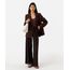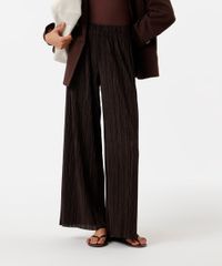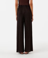 Calça feminina confeccionada em tecido sintético com efeito plissado. Possui modelagem pantalona, cintura alta, cós com elástico embutido e barra à fio. Esta peça possui uma leve transparência.