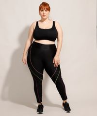 Calça feminina confeccionada em malha encorpada e elástica. O modelo é legging com caimento ajustado, cintura alta e cós largo. Possui detalhes de pespontos contrastantes.