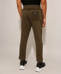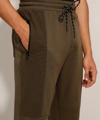 Calça masculina confeccionada em moletom. O produto tem modelagem relaxed que tem gancho deslocado e caimento soltinho. A peça tem recortes frontais e posteriores, com detalhe canelado, bolsos frontais com fechamento em zíper e tem um bolso posterior aplicado. O fechamento é com cadarço no cós.