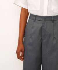 • Detalhes de pregas frontais e bolsos funcionais, unindo o clássico da alfaiataria à praticidade.