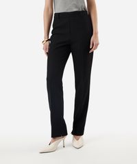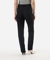 Calça de alfaiataria feminina confeccionada em tecido plano com viscose e elasticidade. A peça tem a modelagem e construção reta e caimento levemente ajustado ao corpo. O modelo tem cintura alta, cós com passantes para cinto e fechamento por zíper. Possui acabamento pespontado nas barras e fendas discretas laterais.