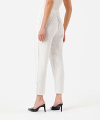 Calça feminina confeccionada em tecido plano com viscose. A peça tem a modelagem e construção reta e o caimento é confortavelmente solto ao corpo. O modelo tem cintura alta, cós com passantes para cinto, elástico embutido, pregas frontais e fechamento por botão e zíper. Possui dois bolsos na parte frontal e dois decorativos na parte posterior. Detalhe de acabamento pespontado nas barras.