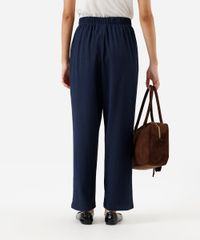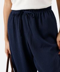 Calça feminina confeccionada em tecido texturizado com toque leve. A peça possui modelagem reta com caimento solto, cintura alta, cós com elástico embutido e cordão decorativo, acabamento pespontado.