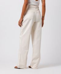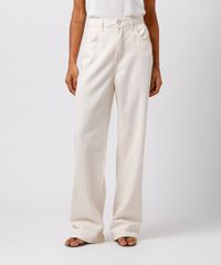 Calça feminina confeccionada em sarja estruturada. A peça tem a modelagem e construção reta e o caimento é confortavelmente solto ao corpo. O modelo tem cintura alta, cós com passantes para cinto e fechamento frontal por botão e zíper. Possui três bolsos na parte frontal e dois aplicados na parte posterior. Detalhe de acabamento pespontado nas barras.