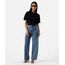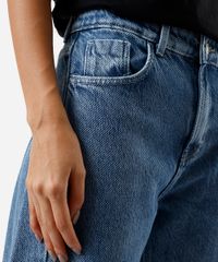 Calça feminina confeccionada em jeans. A peça tem a modelagem reta, caimento oversized e confortavelmente solto ao corpo. O modelo tem cintura média, cós com passantes para cinto e fechamento por botão e zíper. Possui três bolsos na parte frontal, dois posteriores e acabamento pespontado nas barras.