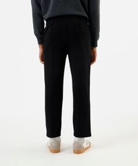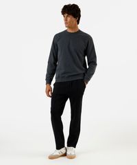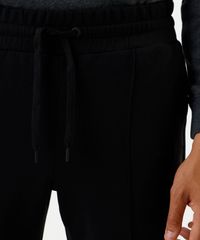 Calça masculina confeccionada em malha encorpada com algodão. A peça tem a modelagem reta, caimento solto ao corpo com nervuras centralizadas. O modelo tem cintura média, cós com elástico embutido e cordão para ajuste. Possui dois bolsos na parte frontal e um embutido na parte posterior. Detalhe de acabamento com pesponto nas barras.