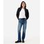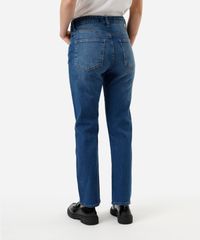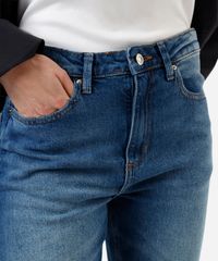 Calça feminina confeccionada em jeans com elasticidade. A peça tem a modelagem reta slim e o caimento é solto ao corpo. O modelo tem cintura alta, cós com passantes para cinto e fechamento por botão e zíper. Possui três bolsos na parte frontal e dois aplicados na parte posterior. Possui acabamento em pesponto contrastante.