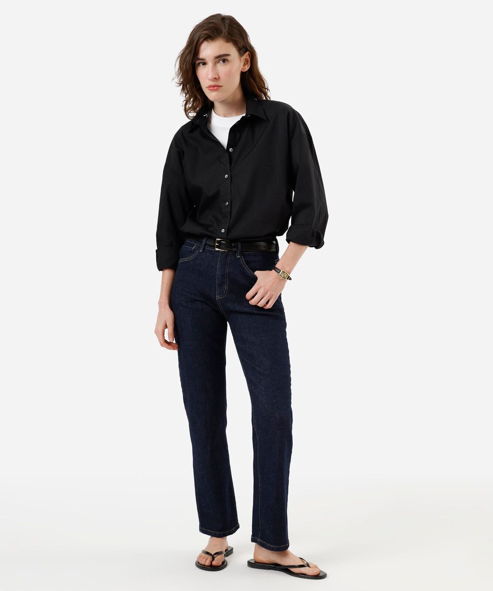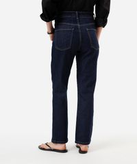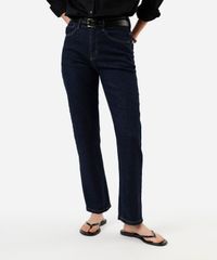 Calça feminina confeccionada em jeans com elasticidade. A peça tem a modelagem reta slim e caimento solto ao corpo. O modelo tem cintura alta, cós com passantes para cinto e fechamento por botão e zíper. Possui três bolsos na parte frontal e dois aplicados na parte posterior. Possui acabamento em pesponto contrastante.