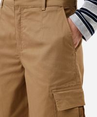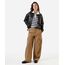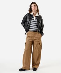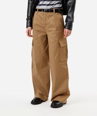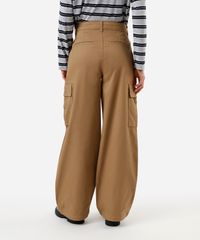 Calça feminina confeccionada em sarja com elasticidade. A peça tem a modelagem skater cargo, com construção reta e o caimento solto ao corpo. O modelo tem cintura baixa, cós com passantes para cinto e fechamento por botão e zíper. Possui dois bolsos faca frontais, dois bolsos utilitários laterais e dois bolsos decorativos posteriores. Detalhe de acabamento pespontado nas barras.