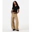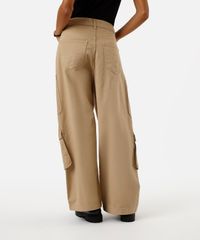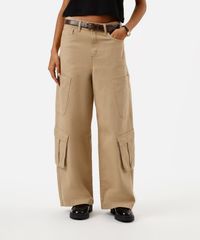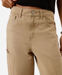 Calça feminina confeccionada em sarja. A peça tem a modelagem skater cargo, com construção reta e o caimento solto ao corpo. O modelo tem cintura média, cós com passantes para cinto e fechamento por botão e zíper. Possui três bolsos na parte frontal, quatro bolsos laterais e dois aplicados na parte posterior. Detalhe de acabamento pespontado nas barras.
