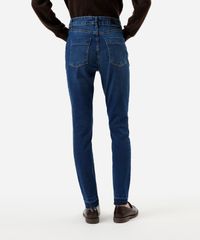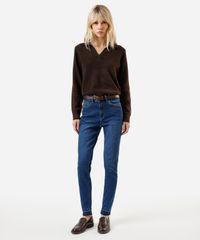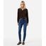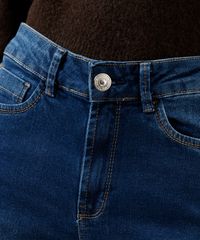 Calça feminina confeccionada em jeans com elasticidade. A peça tem a modelagem skinny, com construção afunilada, caimento ajustado ao corpo e barras a fio. O modelo tem cintura alta, cós com passantes e fechamento por botão e zíper. Possui três bolsos na parte frontal e dois aplicados na na parte posterior. Detalhe de acabamento com pesponto contrastante.