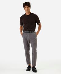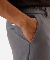 Calça masculina confeccionada em malha com viscose. A peça tem a modelagem slim chino, com corte afunilado e o caimento solto ao corpo. O modelo tem cintura média, cós com passantes, elástico embutido e fechamento por botão e zíper. Possui dois bolsos na parte frontal e dois embutidos na parte posterior. Detalhe de acabamento pespontado nas barras.