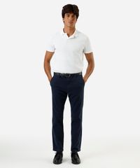 Calça masculina confeccionada em sarja. A peça tem a modelagem slim chino, com construção reta e o caimento é confortavelmente solto ao corpo. O modelo tem cintura média, cós com passantes para cinto e fechamento frontal por botão e zíper. Possui dois bolsos na parte frontal e dois embutidos na parte posterior. Detalhe de acabamento pespontado nas barras.