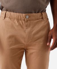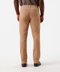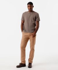Calça masculina confeccionada em sarja com elasticidade. A peça tem a modelagem slim chino, com construção reta e o caimento é levemente solto ao corpo. O modelo tem cintura média, cós com passantes para cinto, elástico embutido e fechamento frontal por botão e zíper. Possui dois bolsos na parte frontal e dois embutidos na parte posterior. Detalhe de acabamento pespontado nas barras.
