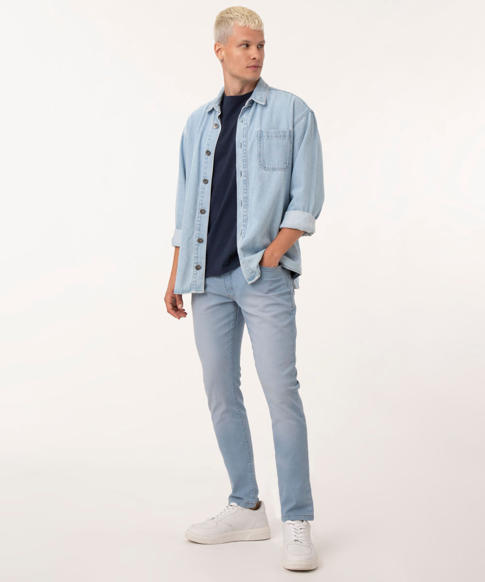 Calça masculina confeccionada em jeans com elasticidade. A modelagem slim tem estrutura reta com leve ajuste em direção à barra. Tem três bolsos frontais e dois posteriores. O cós tem passantes e fechamento por zíper e botão.