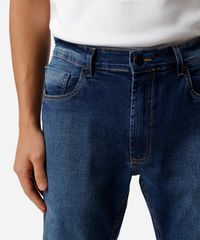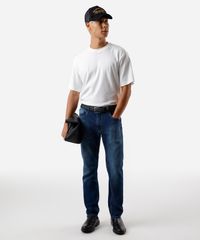Calça masculina confeccionada em jeans. A peça tem a modelagem slim, com construção reta e o caimento solto ao corpo. O modelo tem cintura média, cós com passantes para cinto e fechamento por botão e zíper. Possui três bolsos na parte frontal e dois aplicados na parte posterior. Detalhe de acabamento pespontado nas barras.