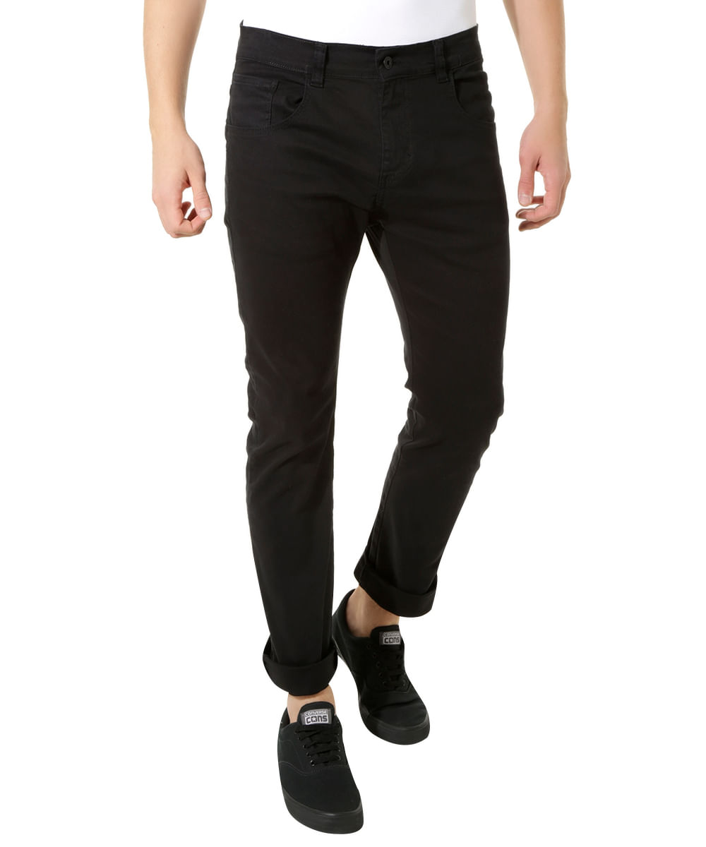 Calça confeccionada em sarja com elastano. A modelagem tem estrutura reta levemente ajustada no tornozelo. A parte frontal conta com três bolsos enquanto a parte posterior conta com dois. O cós tem passantes e o fechamento é por botão e zíper.