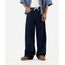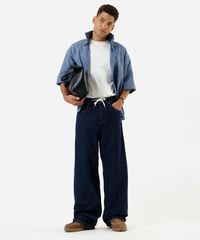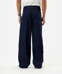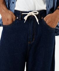 Calça masculina confeccionada em jeans. A peça tem a modelagem super baggy, com construção afunilada e o caimento solto ao corpo. O modelo tem cintura média, cós com passantes para cinto, cordão embutido e fechamento por botão e zíper. Possui três bolsos na parte frontal e dois aplicados na parte posterior. Detalhe de acabamento em pesponto contrastante.