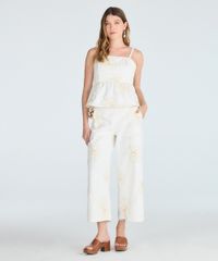 calça wide leg cropped feminina de sarja floral off white