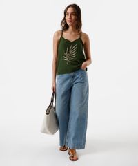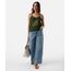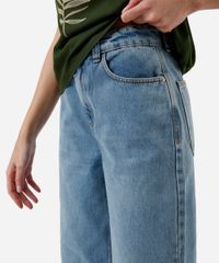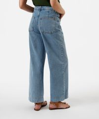 Calça feminina confeccionada em jeans estruturado. A peça tem a modelagem wide leg cropped, com construção reta, caimento solto ao corpo, barras amplas e comprimento encurtado. O modelo tem cintura alta, cós com passantes para cinto e fechamento frontal por botão e zíper. Possui três bolsos na parte frontal e dois aplicados na parte posterior. Detalhe de acabamento pespontado nas barras.