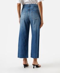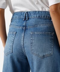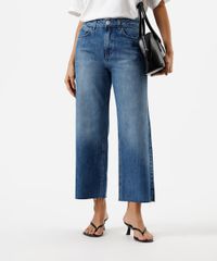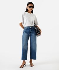 Calça feminina confeccionada em jeans. A peça tem a modelagem wide leg, com construção reta, caimento confortavelmente solto ao corpo e comprimento cropped. O modelo tem cintura alta, cós com passantes para cinto e fechamento frontal por botão e zíper. Possui três bolsos na parte frontal e dois aplicados na parte posterior. Detalhe de acabamento a fio nas barras.