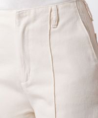 Calça feminina confeccionada em sarja estruturada de algodão. A peça tem a modelagem wide leg, com construção reta, caimento confortavelmente solto ao corpo e barras levemente amplas. O modelo tem cintura alta, cós sem recorte com passantes para cinto, nervuras centralizadas que se estendem pelo comprimento e fechamento frontal por colchete e zíper. Possui dois bolsos faca na parte frontal e dois aplicados na parte posterior, todos funcionais e o acabamento é pespontado nas barras.