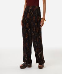 Calça feminina confeccionada em malha texturizada com estampa étnica. A peça tem a modelagem wide leg, com construção reta e o caimento é confortavelmente solto ao corpo. O modelo tem cintura alta e cós com elástico embutido. Possui dois bolsos na parte frontal e acabamento pespontado nas barras.