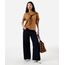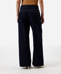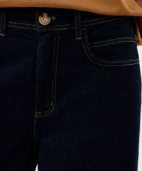 Calça feminina confeccionada em jeans. A peça tem a modelagem wide leg, com construção reta, caimento solto ao corpo e comprimento cropped. O modelo tem cintura alta, cós com passantes para cinto e fechamento frontal por botão e zíper. Possui três bolsos na parte frontal e dois aplicados na parte posterior. Detalhe de acabamento em pesponto contrastante.