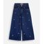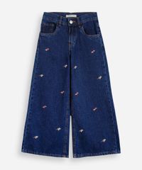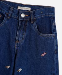 Calça infantil confeccionada em jeans com bordado floral na parte frontal. A peça tem a modelagem wide leg, com construção reta e o caimento é solto ao corpo. O modelo tem cintura média, cós com passantes para cinto e fechamento por botão e zíper. Possui três bolsos na parte frontal e dois aplicados na parte posterior. Detalhe de acabamento pespontado nas barras.