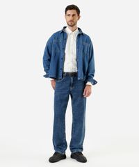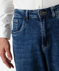 Calça masculina confeccionada em jeans com elasticidade. A peça tem a modelagem wide leg, com construção reta, caimento solto ao corpo e barras levemente amplas. O modelo tem cintura média, cós com passantes para cinto e fechamento por botão e zíper. Possui três bolsos na parte frontal e dois aplicados na parte posterior. Detalhe de acabamento pespontado nas barras.
