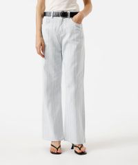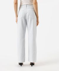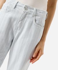Calça feminina confeccionada em jeans estruturado com padronagem listrada. A peça tem a modelagem wide leg slim, com construção reta e o caimento é confortavelmente solto ao corpo. O modelo tem cintura alta, cós com passantes para cinto e fechamento frontal por botão e zíper. Possui três bolsos na parte frontal e dois aplicados na parte posterior. Detalhe de acabamento pespontado nas barras.
