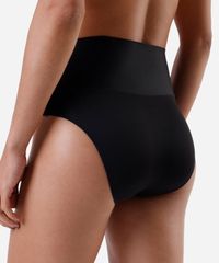 Calcinha feminina confeccionada em malha de poliamida. A peça tem modelagem hot pant, com caimento ajustado, laterais largas, cintura alta elástica e maior cobertura posterior.