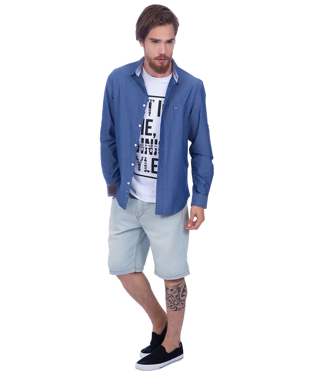 Confeccionada em tecido leve e confortável essa camisa foi feita pensando em você! O modelo em jeans, tem gola esporte, fechamento frontal por botões, mangas longas e bolsos frontais. Seu destaque fica na lavagem estonada que é de surpreender. Em ocasiões especiais, combine com calça e sapatênis para impressionar!