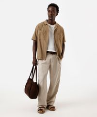 Camisa masculina confeccionada em tecido plano com algodão. A peça tem construção reta e o caimento é amplo e confortavelmente solto ao corpo. O modelo tem gola esporte aplicada, fechamento frontal por botões, mangas curtas e bolsos frontais.