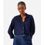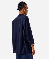 Camisa feminina confeccionada em tecido plano de viscose e linho. A peça tem a modelagem e construção reta e o caimento é confortavelmente solto ao corpo. O modelo tem gola esporte aplicada, decote v, fechamento frontal por botões em vista e mangas 7/8 com botão nos punhos. Detalhe de acabamento pespontado na barra.