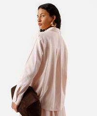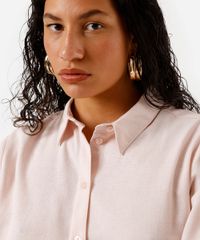 Camisa feminina confeccionada em tecido plano com viscose e linho. A peça tem a modelagem e construção reta e o caimento é confortavelmente solto ao corpo. O modelo tem gola esporte aplicada, fechamento frontal por botões em vista e mangas longas com botão nos punhos. Detalhe de acabamento pespontado na barra.