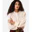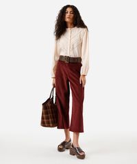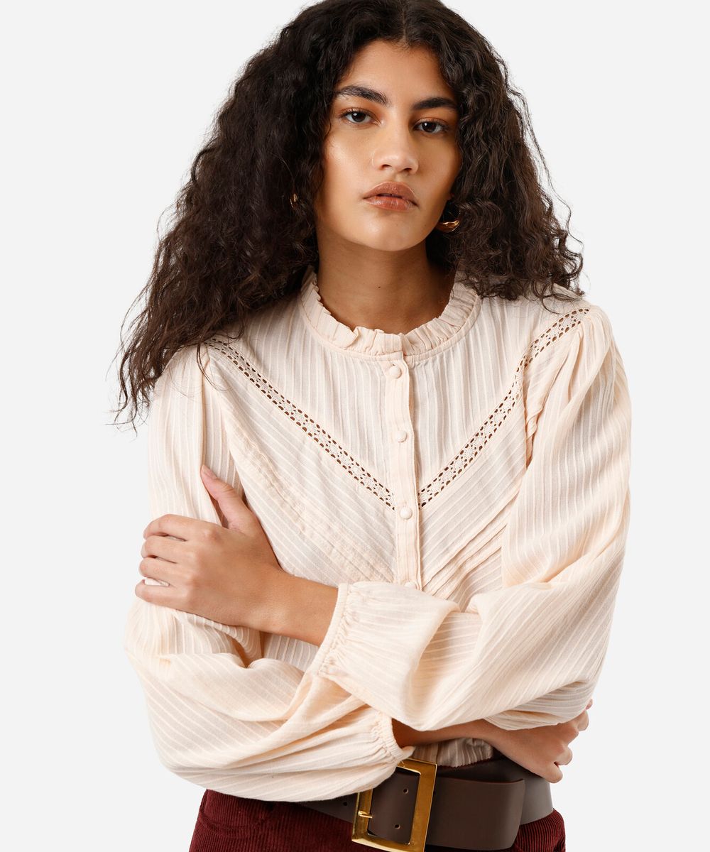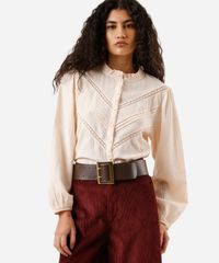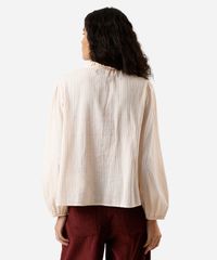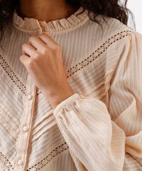 Camisa feminina confeccionada em tecido plano de algodão com textura listrada. A peça tem a modelagem e construção reta, caimento solto ao corpo com pregas e renda. O modelo tem decote redondo com babado aplicado, fechamento por botões forrados em vista e mangas longas com elástico nos punhos. Detalhe de acabamento pespontado na barra.