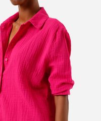 Camisa masculina confeccionada em tecido plano texturizado de algodão. A peça tem a modelagem e construção reta e o caimento é confortavelmente solto ao corpo. O modelo tem gola esporte aplicada, fechamento frontal por botões em vista e mangas 3/4 com botão nos punhos. Detalhe de acabamento pespontado na barra.