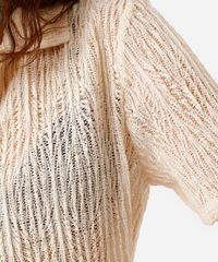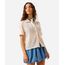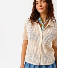 Camisa feminina confeccionada em tricot com tramas espaçadas. A peça tem a modelagem e construção reta e o caimento é confortavelmente solto ao corpo. O modelo tem gola esporte aplicada, fechamento frontal por botões em vista e mangas curtas. Detalhe de acabamento pespontado na barra.