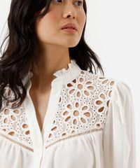 Camisa feminina confeccionada em tecido plano de viscose com recorte em laise. A peça tem a modelagem e construção reta e o caimento é confortavelmente solto ao corpo. O modelo tem decote V, fechamento frontal por botões em vista e mangas longas com elástico nos punhos. Detalhe de acabamento pespontado na barra.