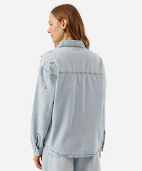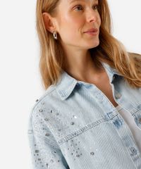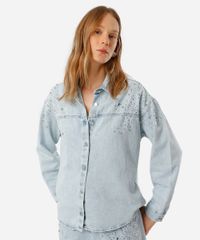Camisa feminina confeccionada em jeans com aplicação de brilhos A peça tem a modelagem e construção reta e o caimento é confortavelmente solto ao corpo. O modelo tem gola esporte aplicada, fechamento frontal por botões em vista e mangas longas com botão nos punhos. Detalhe de acabamento pespontado na barra.