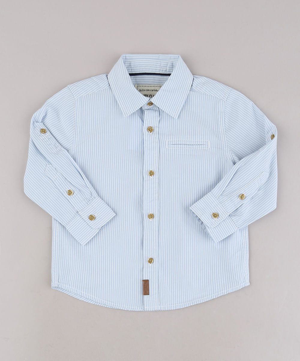 Camisa infantil masculina confeccionada em tecido plano leve. É estampada listrada em off white. A parte frontal tem bolso embutido e fechamento por botões. A gola é esporte e as mangas são longas, com martingale e botão para fixá-las caso estejam dobradas, e fechamento por botões nos punhos. A barra tem acabamento arredondado.