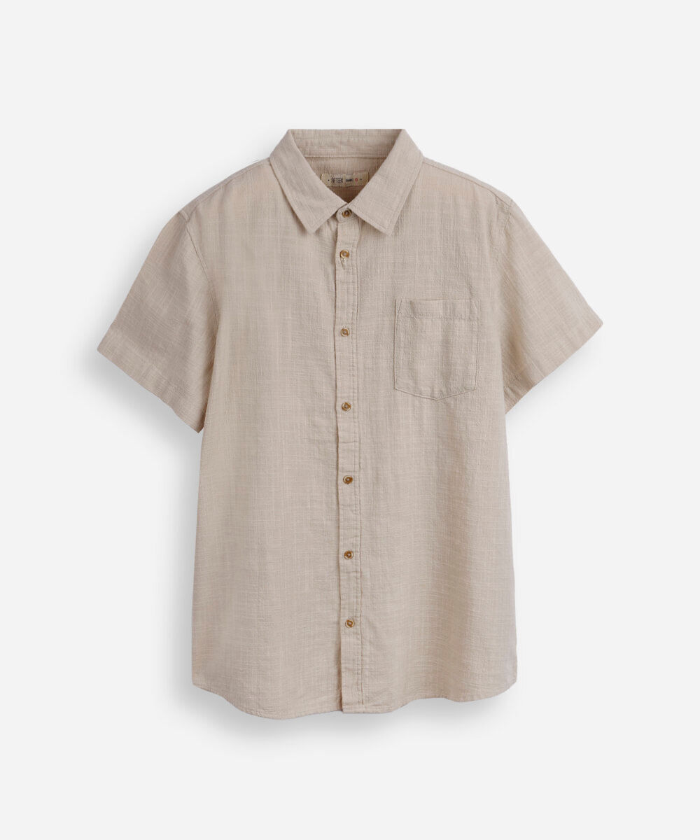 Camisa juvenil confeccionada em tecido plano de algodão texturizado. A peça tem a modelagem e construção reta e o caimento é confortavelmente solto ao corpo. O modelo tem gola esporte, bolso aplicado, fechamento frontal por botões em vista e mangas curtas. Detalhe de acabamento pespontado na barra.
