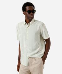 Camisa masculina confeccionada em tecido plano texturizado de viscose e poliamida com estampa floral. A peça tem a modelagem e construção reta e o caimento é confortavelmente solto ao corpo. O modelo tem gola esporte aplicada, fechamento frontal por botões em vista e mangas curtas. Detalhe de acabamento pespontado na barra e nos punhos.