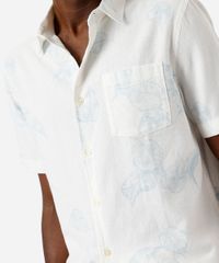 Camisa masculina confeccionada em tecido plano de algodão com estampa de folhagens. A peça tem a modelagem e construção reta e o caimento é confortavelmente solto ao corpo. O modelo tem gola esporte aplicada, fechamento frontal por botões em vista, bolso aplicado e mangas curtas. Detalhe de acabamento pespontado na barra e nos punhos.
