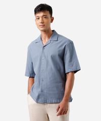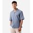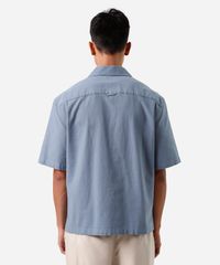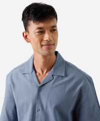 Camisa masculina confeccionada em algodão. Possui modelagem reta, caimento solto e confortável, gola esporte, mangas curtas e fechamento frontal com abotoamento central.