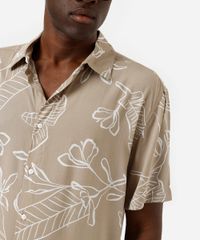 Camisa masculina confeccionada em tecido plano de viscose com estampa de folhagens. A peça tem a modelagem e construção reta e o caimento é confortavelmente solto ao corpo. O modelo tem gola esporte aplicada, fechamento frontal por botões em vista e mangas curtas. Detalhe de acabamento pespontado na barra.