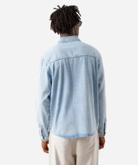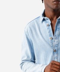 Camisa masculina confeccionada em jeans. A peça tem a modelagem e construção reta e o caimento é confortavelmente solto ao corpo. O modelo tem gola esporte aplicada, fechamento frontal por botões em vista e mangas longas com botão nos punhos. Detalhe de acabamento pespontado na barra.